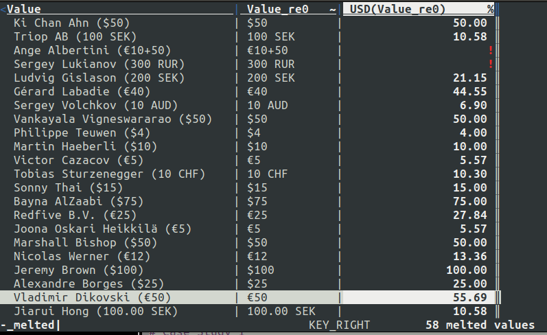 Since the donations are all in different currencies, Saul made a plugin called USD. He uses the plugin's USD() function at the final step in the case study. USD() takes a number and a currency code or currency symbol, and converts it into US dollars based on the current day's currency rates. If you want to follow along with the final step of the tutorial, before you launch your VisiData session you will need to add the USD() code to your ~/.visidatarc or install it as a plugin. Then its functions will be added to your session's scope. This is completely optional, and only comes to play at the end.